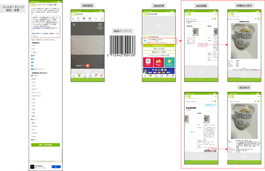 情報登録のある加工食品の商品バーコードを読み取ることで、栄養成分表示や食品情報を参照できるだけでなく、ユーザーのアレルゲン設定に基づいて食品表示内容を解析し、該当するアレルゲンが含まれる可能性がある場合にはアプリ上で通知します。これにより、食物アレルギーを持つユーザーやその家族にとって、より安心で効率的な食品選びを支援します。