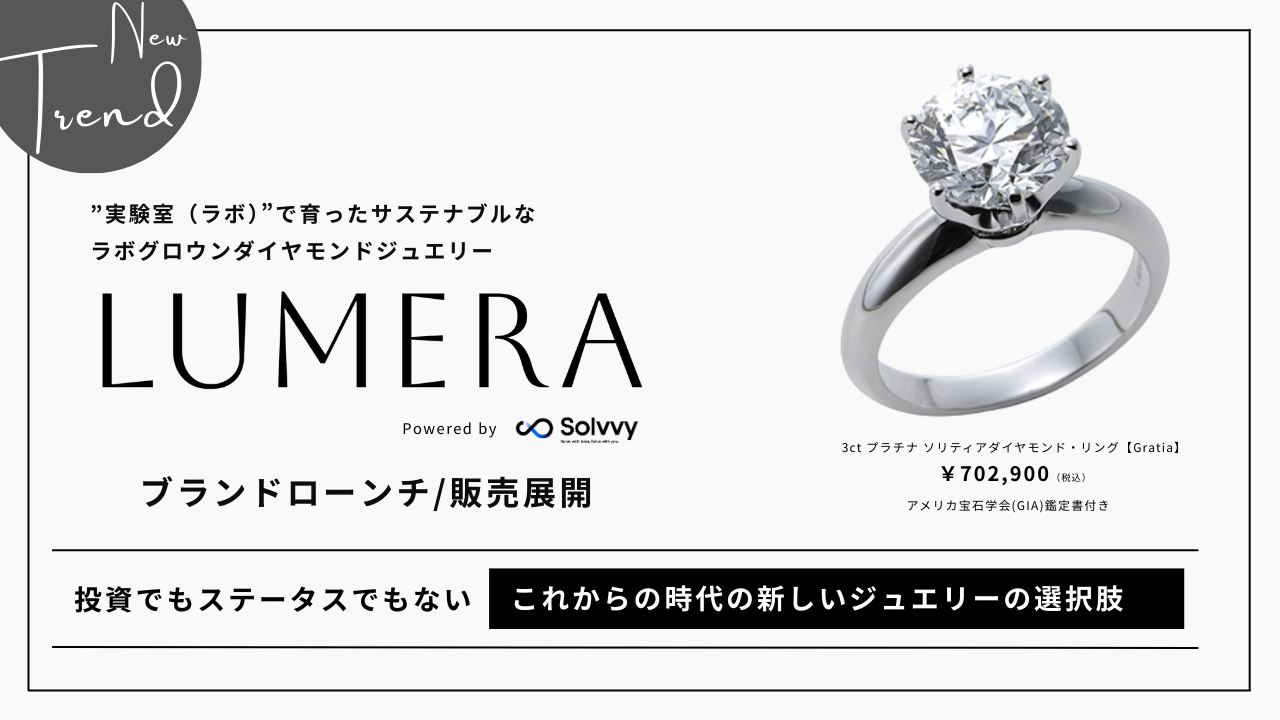 Solvvy株式会社(本社:東京都、代表取締役:安達慶高、以下「当社」)は、グループ内の最先端技術研究機関である「Solvvy LAB.」を通じた新たなテクノロジーの支援・普及を推進することを目的とし、実験室で育ったサステナブルな本物のダイヤモンドとして知られるラボグロウンダイヤモンドの新ブランドLUMERA(ルメラ)をローンチいたしました。